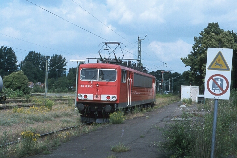 Gleicher Standort, gleiche Blickrichtung - nur 30 Jahre später: eine 155 hat einen Güterzug nach Bettenhausen gebracht und wartet auf die Rückfahrt. Das Empfangsgebäude ist abgerissen und die Anlagen machen einen ungepflegten Eindruck. 29.06.2001 |