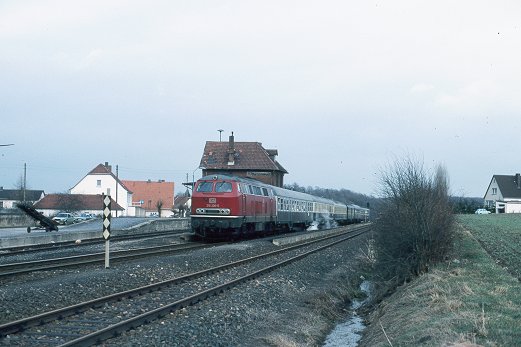 Eine 216 vom Bw Kassel beschleunigt mit einem Personenzug in Fürstenwald. Sie hat immerhin sechs Vierachser am Haken! (Aufnahme vom 19. März 1981). Die örtlichen Gütergleise sind zwar gegenüber dem Ursprungszustand zurückgebaut, aber noch vorhanden. Auch das zweite Bahnsteiggleis liegt noch.