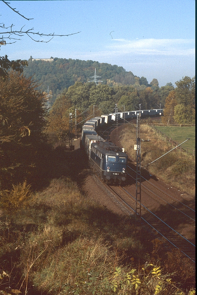 | An der Burg vorbei ziehr eine 110 (!) den Containerzug Richtung Kassel (28. Oktober 1980). |