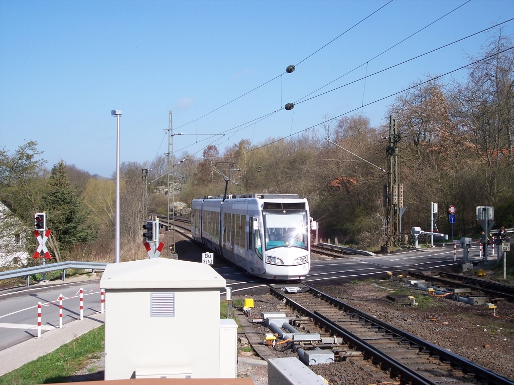 | Eine Regiotram aus Hofgeismar-Hümme passiert den Bahnübergang im Zuge der Strasse "Steinerne Brücke" am 12. April 2008. |