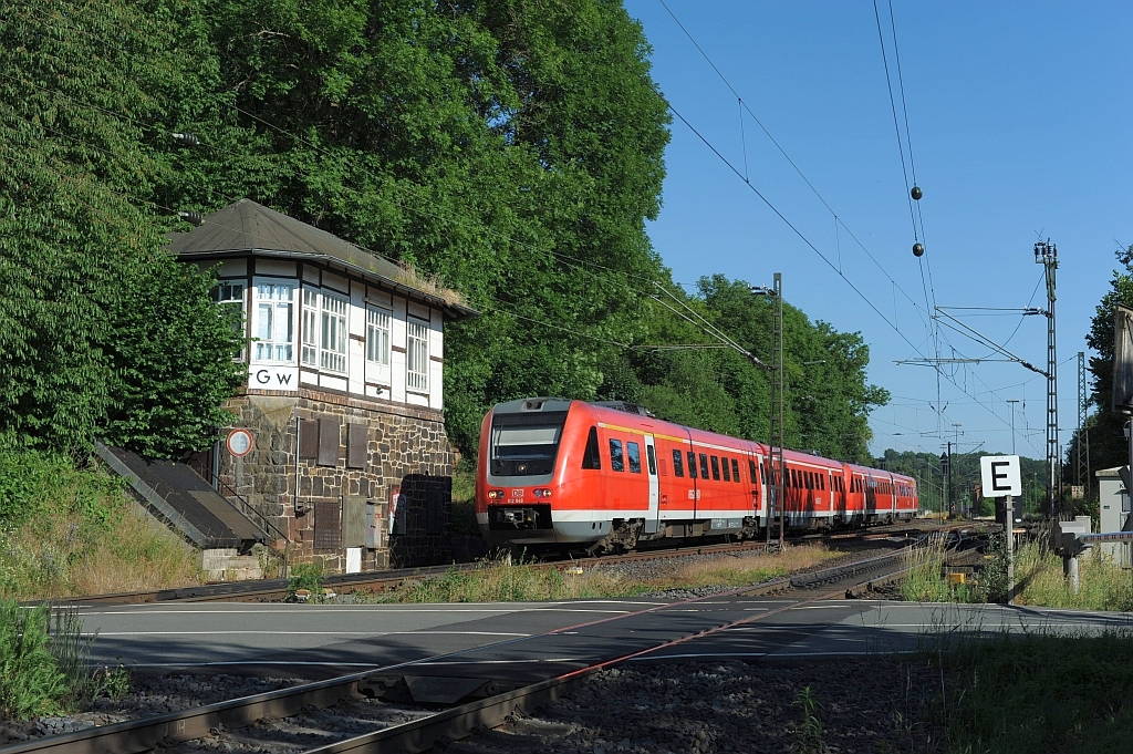 | Gegenrichtung: Am 30.06.2015 setzt der 612 seine Reise als RE Kassel- Hagen nach einem Zwischenhalt in Grebenstein fort. |