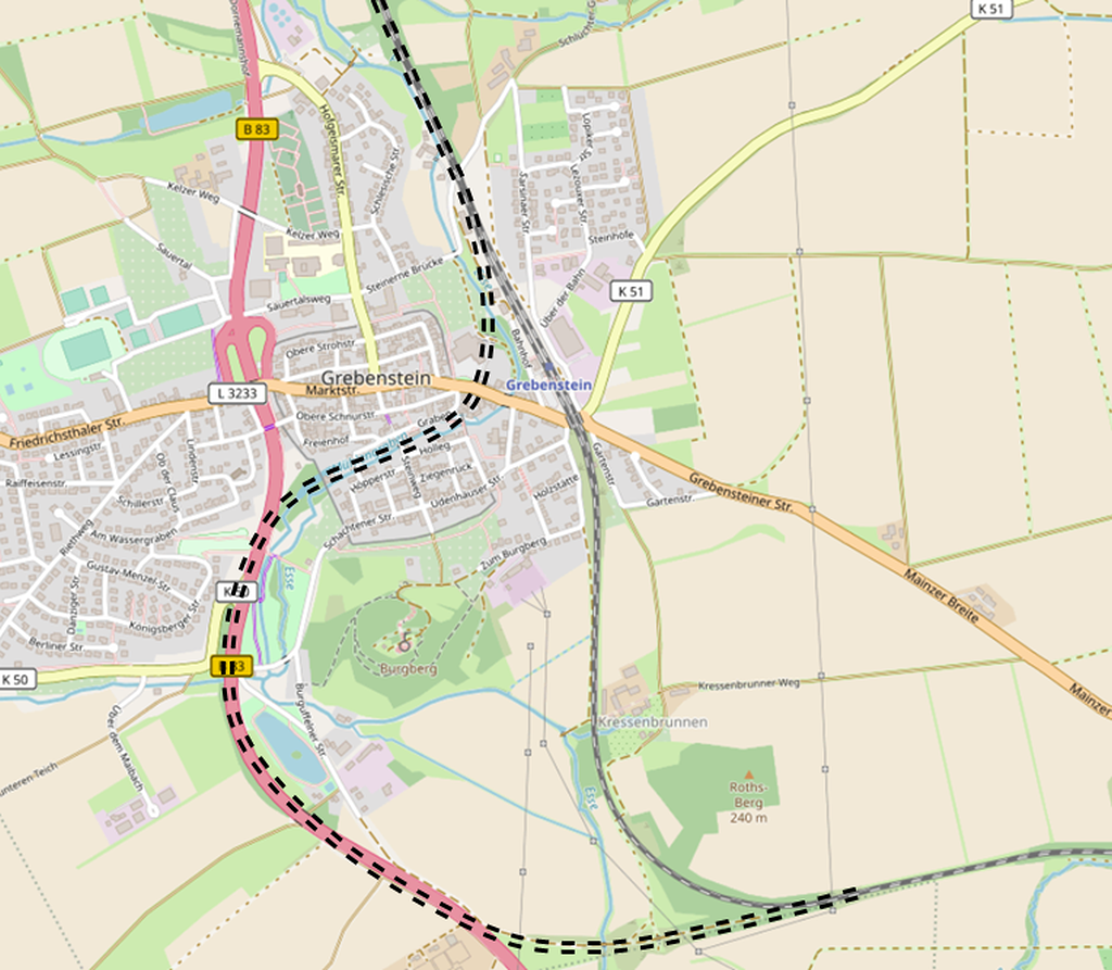 | Am südlichen Ortsrand erkennt man den alten Bahndamm einschliesslich der Durchführung der Esse schon von weitem in der Landschaft. |