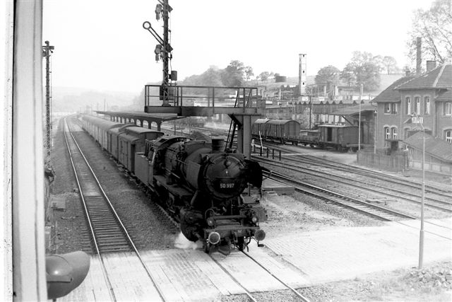 Nach einem Halt in Grifte nimmt 50 997 mit ihrem Personenzug nach Kassel wieder Fahrt auf. |