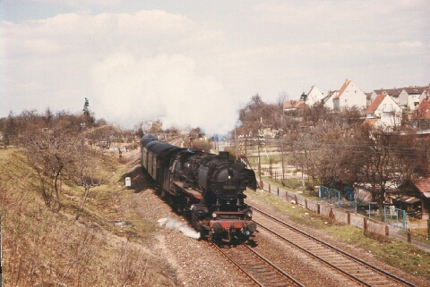 Fast der gleiche Standort wie im vorigen Bild, jedoch ist diesmal eine BR 50 mit Personenzug aus Wolfhagen abgelichtet.