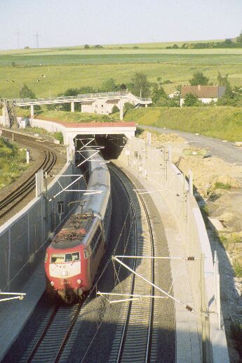 ![]() Der Verkehr fließt über die Gleise der NBS. Dieser InterRegio verläßt gerade den ... Tunnel. Die Schienen für den Nahnverkehr liegen rechts und links oberhalb des Troges |