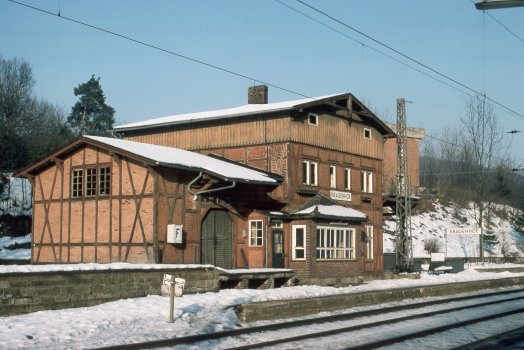 Empfangsgebäude und Güterschuppen, im Hintergrung der Turm für die Flak- Geschütze, welche die Kragenhöfer Brücke schützen sollten. (Februar 1981)