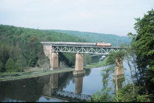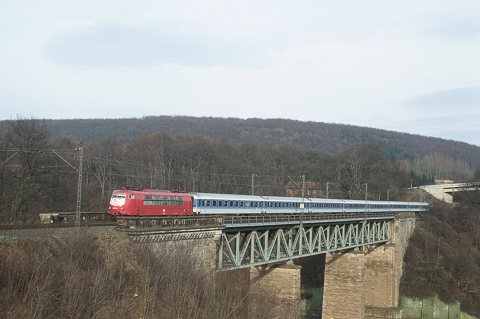 Wiederaufgebaute Brücke mit Schnellzug in 1984. Heute ist diese Aufnahme nicht mehr möglich, da die alte Brücke von dem Betonbauwerk der Neubaustrecke verdeckt wird.