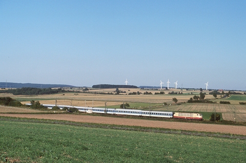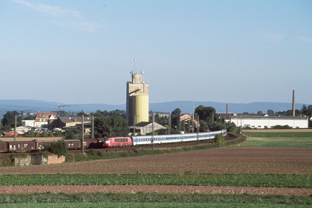 Der abendliche Interregio nach Düsseldorf durcheilt Mönchehof im Sommer 1999.