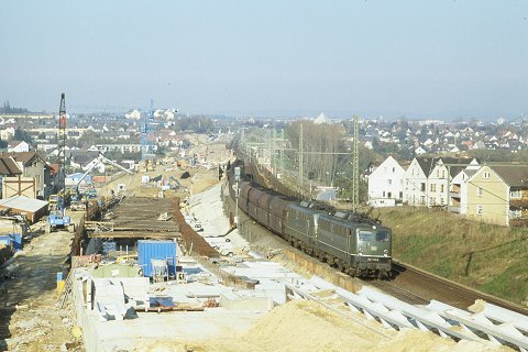 | Auf diesem Bild, aufgenommen von einer Fußgängerbrücke, sieht man deutlich den im Bau befindlichen Tunnel der NBS. Der Kohlezug mit 2x 140 fährt Richtung Süden (November 1988). |