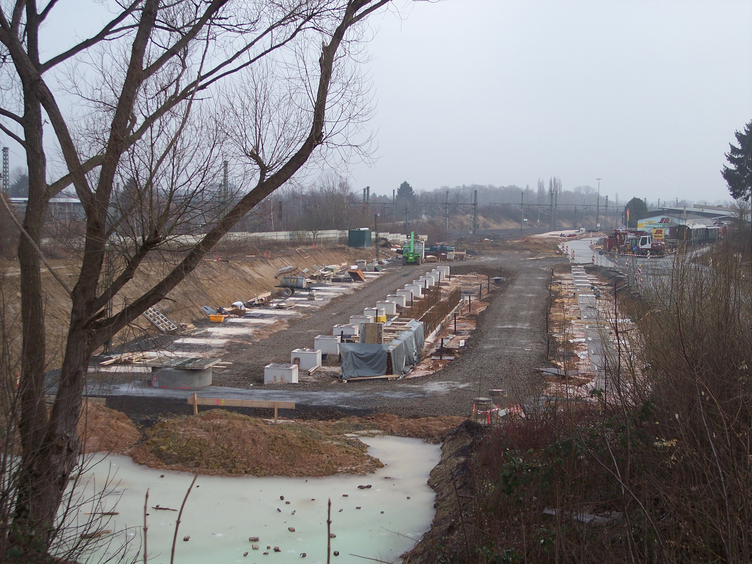 Blick von Norden auf das Gelände des ehemaligen Kleinbahnhofes Wilhelmshöhe Süd. Die CANTUS- Bahn baut eine Betriebswerkstatt. |