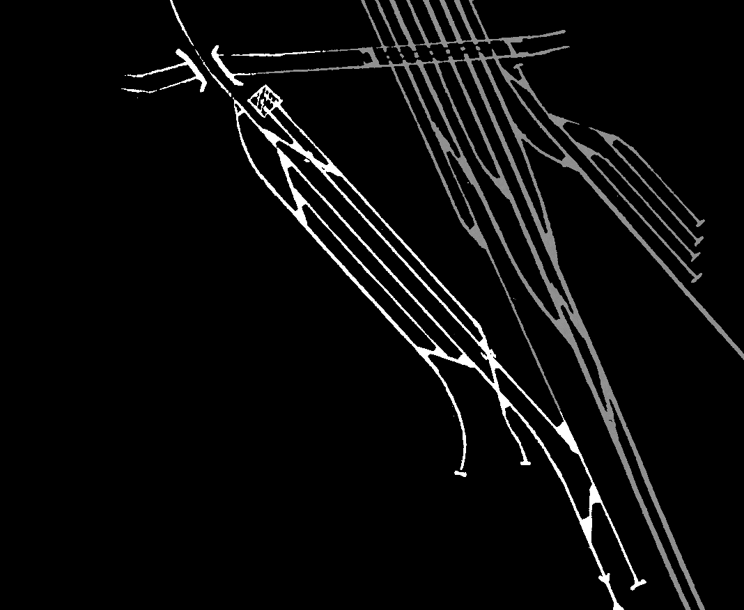 ![]() Gleisplan im Zustand von 1966. Die Brücke am Nordende ist falsch dargestellt! Es handelt sich in Wirklichkeit um eine Strassenüberführung. |