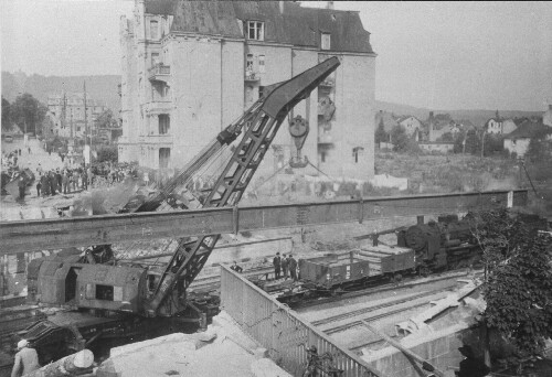 Die Strassenbrücke im Zuge der Wilhelmsöher Allee überlebte den zweiten Weltkrieg. In der Nacht vom 20. zum 21. August 1946 jedoch wurde sie durch einen brennenden Kesselwagen zerstört. Während der damals noch spärliche Strassenverkehr wohl leicht über die benachbarten Brücken bzw. durch die Unterführung Regentenstrasse umgeleitet werden konnte, ergaben sich für die Strassenbahn erhebliche Behinderungen: der Betriebshof Wilhelmshöhe war vom Netz getrennt! Mit grossem Aufwand wurden die erforderlichen Wagen auf Tiefladern auf die Ostseite der beschädigten Brücke transportiert, um von dort aus den Strassenbahnbetrieb in Kassel aufrecht zu erhalten. Recht schnell wurde eine Behelfsbrücke errichtet, die wiederum in 1947 durch einen Neubau ersetzt wurde. Dieser "Neubau" musste 1988 dem als Brücke ausgeführten Bahnhofsvorplatz (Willy Brandt- Platz) weichen. Das Bild zeigt das Einhängen der Träger für die neue Brücke. | ![]() |