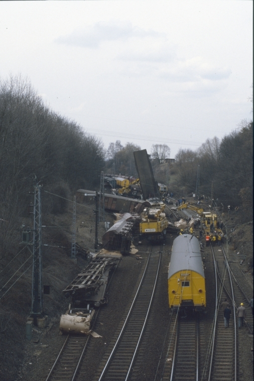 Unter dem Richtung Kassel fahrenden Güterzug Sg5299 wird eine Weiche zu früh umgelegt. Der hintere Zugteil gerät auf das Gegengleis. Der aus Kassel kommende Sg5230 stößt frontal auf den "Geisterfahrer". Laut Ritzau, Katastrophen der deutschen Bahnen, Teil 2, gab es keine Toten und Verletzten, wohl aber erheblichen Sachschaden. | |
