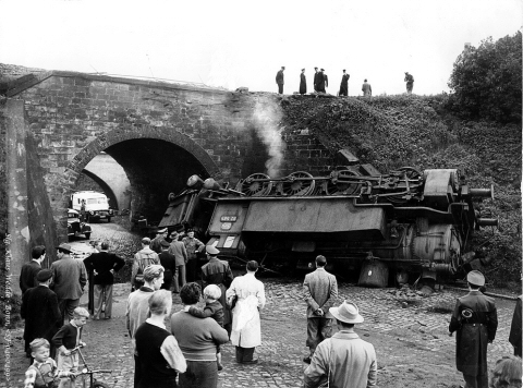 Ein Güterzug überfährt einen Prellbock, Lok, Begleitwagen und fünf Güterwagen stürzen einen Hang hinunter. Lokführer, Heizer und Zugführer werden getötet. | |