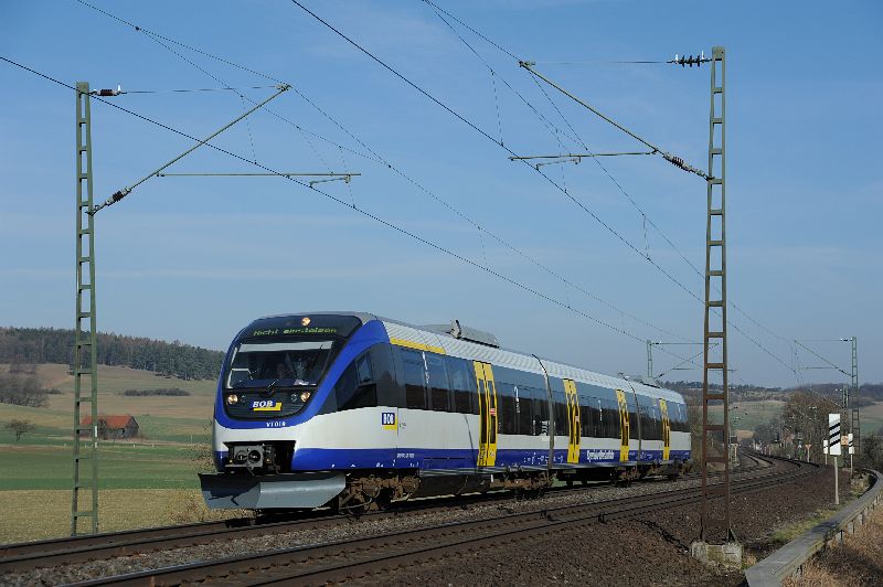 TALENT der Bayrischen Oberland-Bahn auf Überführungsfahrt zwischen Hümme und Hofgeismar. |