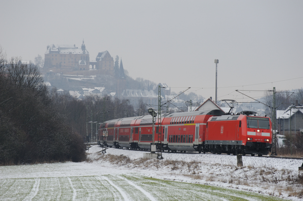 146 117 befödert den RE4159 nach Frankfurt/Main. Es ist bereits der 17. März und es liegt immer noch Schnee! |