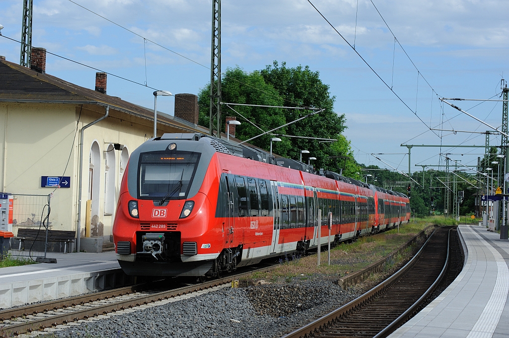 Im Juni fand in Kassel der Hessentag statt. Die DB verlängerte die RE Frankfurt - Treysa in die nordhessische Metropole. Hier fährt am 16.6. ein 442-Doppel durch Guntershausen. |