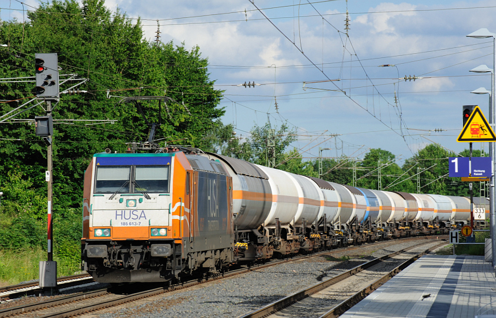 Die Lackierung der HUSA-185 613 passt gut zu den Kesselwagen. Die tiefstehende Sonne und eindrucksvolle Wolkern machen die Stimmung perfekt. Mönchehof, 21. Juni. |