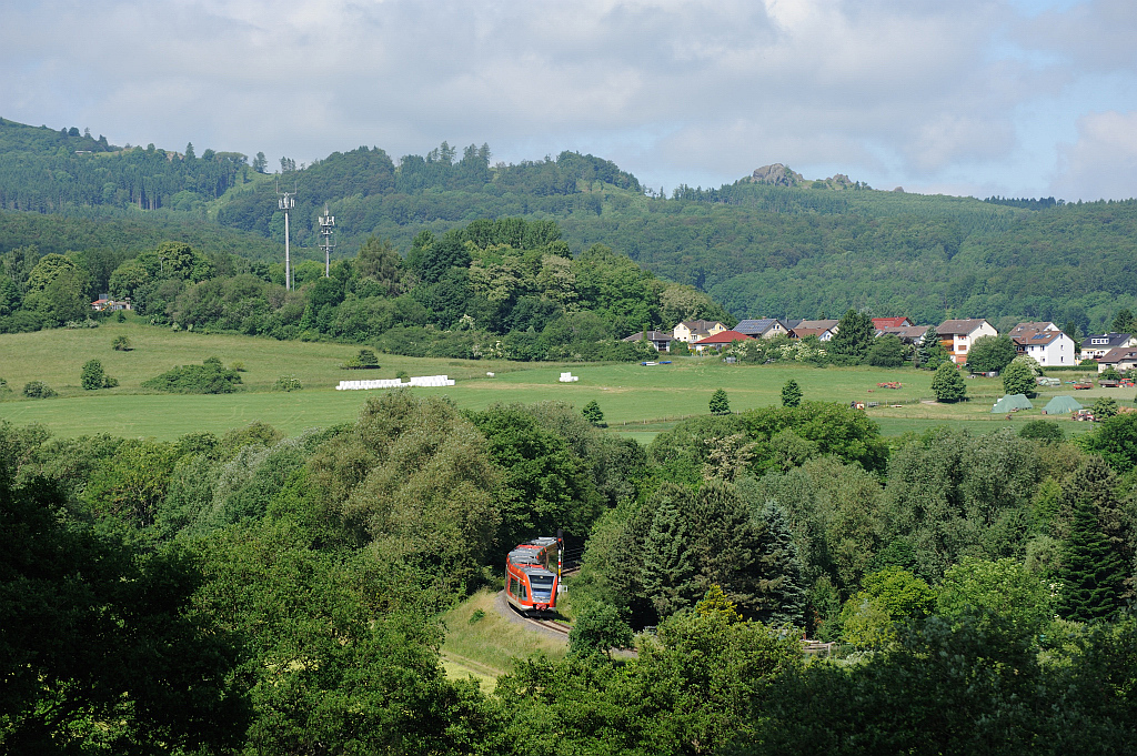 Der 12. Juli war ein schöner Sommertag, der nicht ungenutzt verstreichen sollte: ein 646 als RE23025 erklimmt die Steigung zwischen Zierenberg und Oberelsungen auf der Fahrt nach Korbach. |