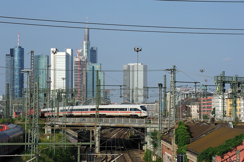 Dank einer neuen Umgehungsstraße und einer dazugehörigen Eisenbahnbrücke ergeben sich neue Perspektiven auf die Friedrich-Wilhelms-Nordbahn: ICE1223 hat gerade Hofgeismar hinter sich gelassen und muß mit weniger als einem Drittel seiner Höchstgeschwindigkeit gen Kassel bummeln. |