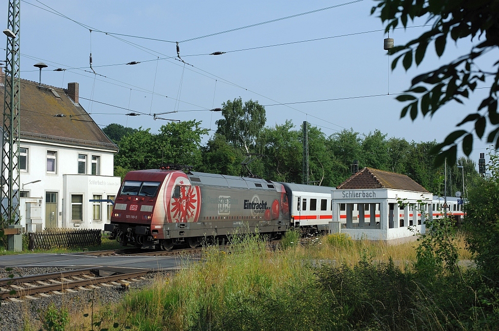 101 110 fährt am 16. Juli mit IC2277 durch Schlierbach (an der Main-Weser-Bahn) mit den charakteristischen Bahnsteigunterführungen. |