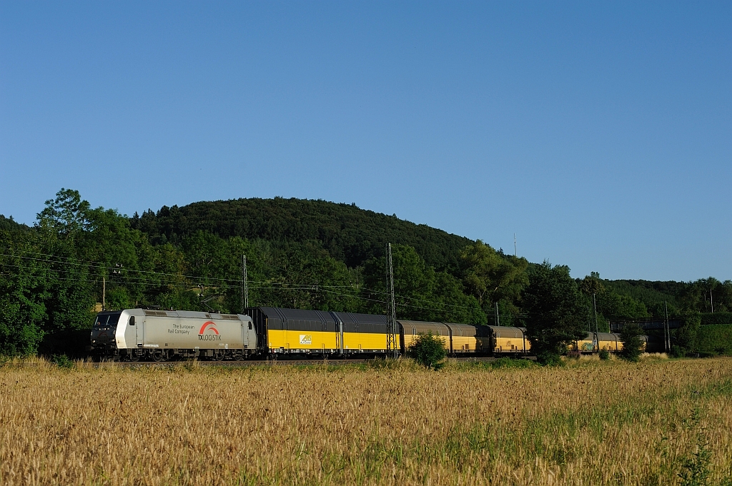 Es war schon spät und die Sonne stand tief, als diese TXL-185 mit einem Autozug am 21. Juli durch Hoheneiche (bei Eschwege) Richtung Norden polterte. |