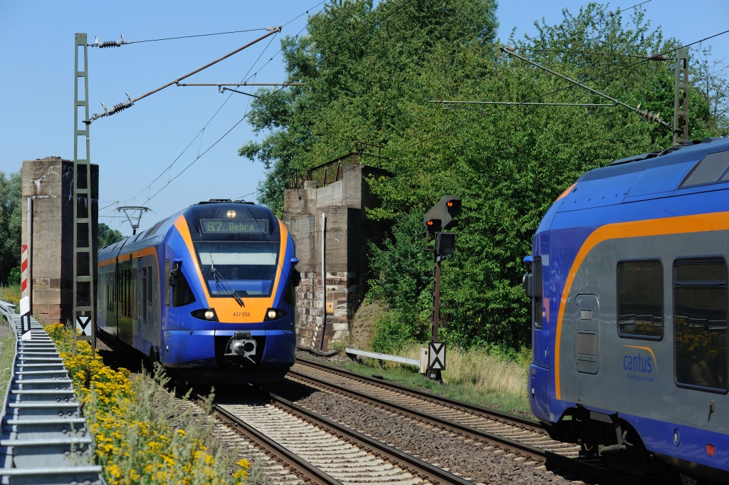 Begegnung zweier FLIRT auf der Nord-Süd-Strecke zwischen Niddawitzhausen und Reichensachsen am 2. August. Pfeiler und Widerlager gehören zur ehemaligen Nebenbahn Eschwege-Kassel. |