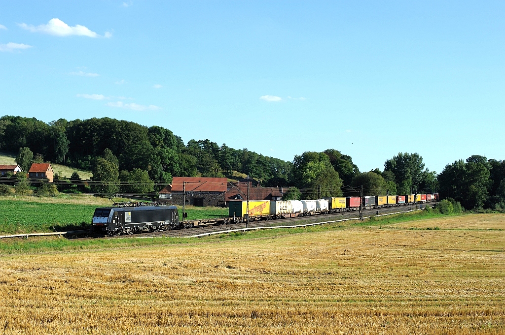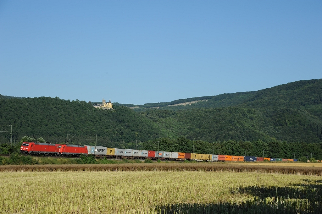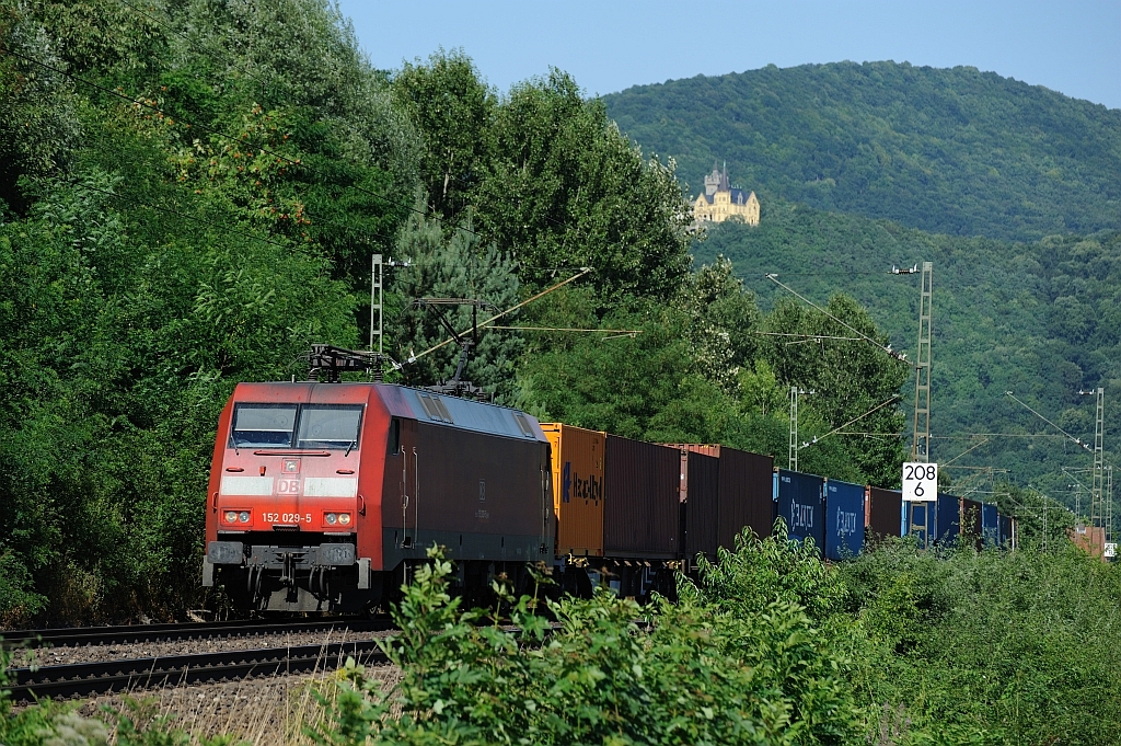 152 029 mit einem Containerzug auf der Nord-Süd-Strecke unterhalb des Schlosses Rothestein bei Bad Sooden Allendorf, 2. August. |