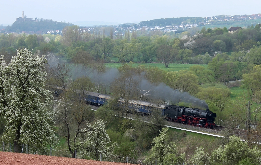 Eingerahmt von Kirschblüten macht 01 1066 auf der Rückfahrt bei Rengershausen ordentlich Dampf. Foto: Dr. Klaus-Peter Lorenz