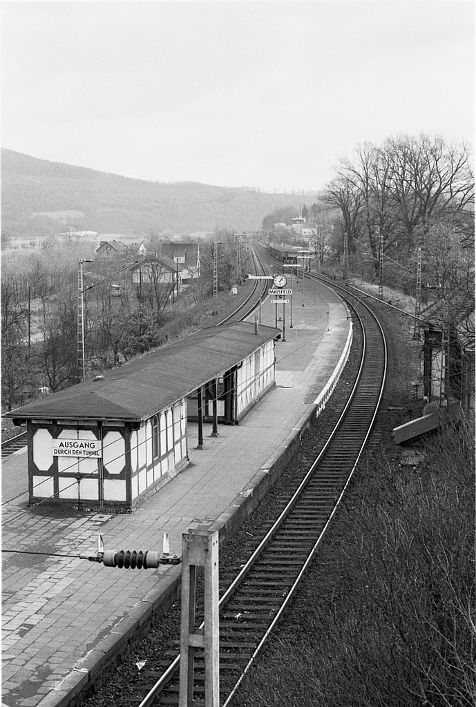 Mitfahrt auf einem 795 am 23. Februar 1974: Warten auf den Schienenbus aus Eschwege, dann Start in Walkappel Richtung Malsfeld. |