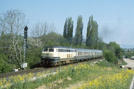 Nur wenige Meter weiter östlich kam am 08.07.1981 dieses Bild von 216 223 vor dem Nahverkehrszug 7909 zustande. Für Überraschung sorgte der Vorkrieges-Eilzugwagen hinter der Lok. | ||||||||||||||||||||||||||||||||||||||||||||||||||||||||||||||||||||||||||||||||||||||||||||||||||||||||