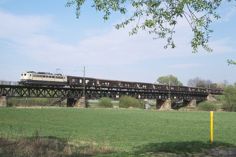 Die Fuldabrücke mit einem Übergabezug im Jahr 1990. | ||||||||||||||||||||||||||||||||||||||||||||||||||||||||||||||||||||||||||||||||||||||||||||||||||||||||