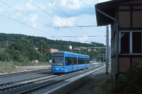 Hessisch Lichtenau ist der Endpunkt der Strassenbahn. Sie fährt ins Zentrum, der abseits gelegene "Bundesbahnhof" wird nicht mehr im Personenverkehr bedient. Die nahegelegene Blücherkaserne ist aufgegeben. |