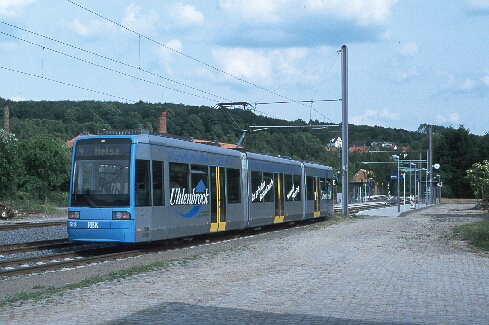 Ein Zug der Linie 8 hat soeben die Wendeschleife "Papierfabrik" verlassen und wartet an der gleichnamigen Haltestelle auf die Abfahrt Richtung "Hessenschanze". Im Hintergrund rangiert 294 237 im Anschluß "Hackländer". Am linken Bildrand erkennt man die Weiterführung der Strecke nach Ober/Nieder-Kaufungen und Helsa. Aufnahme vom 15. 06.2001. | ||||||||||||||||||||||||||||||||||||||||||||||||||||||||||||||||||||||||||||||||||||||||||||||||||||||||