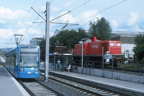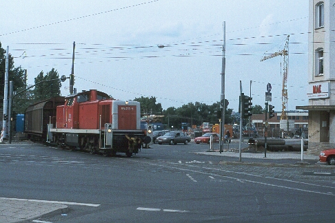 In Bettenhausen überquert das Anschlußgleis zum Hafen die vielbefahrene Leipziger Straße. Auch die Gleise der Straßenbahn werden dabei gekreuzt. Im Hintergrund sieht man die Baustelle des Straßenbahn- Betriebshofes Sandershäuser Straße. Aufnahme vom 15. Juni 2001. Früher begann in Bettenhausen auch die Söhrebahn nach Wellerode. |