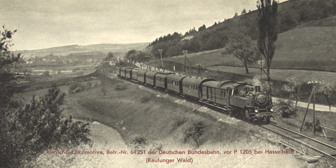 Wunderschöne Aufnahme aus einer HENSCHEL-Publikation aus den 1930er Jahren: 64 251 (Fabriknummer 22179, Baujahr 1933) vor einem Personenzug auf der Fahrt von Kassel nach Eschwege bei Hasselbach (P1205, Kassel ab 10:00 Uhr, Waldkappel an 11:33 Uhr) |