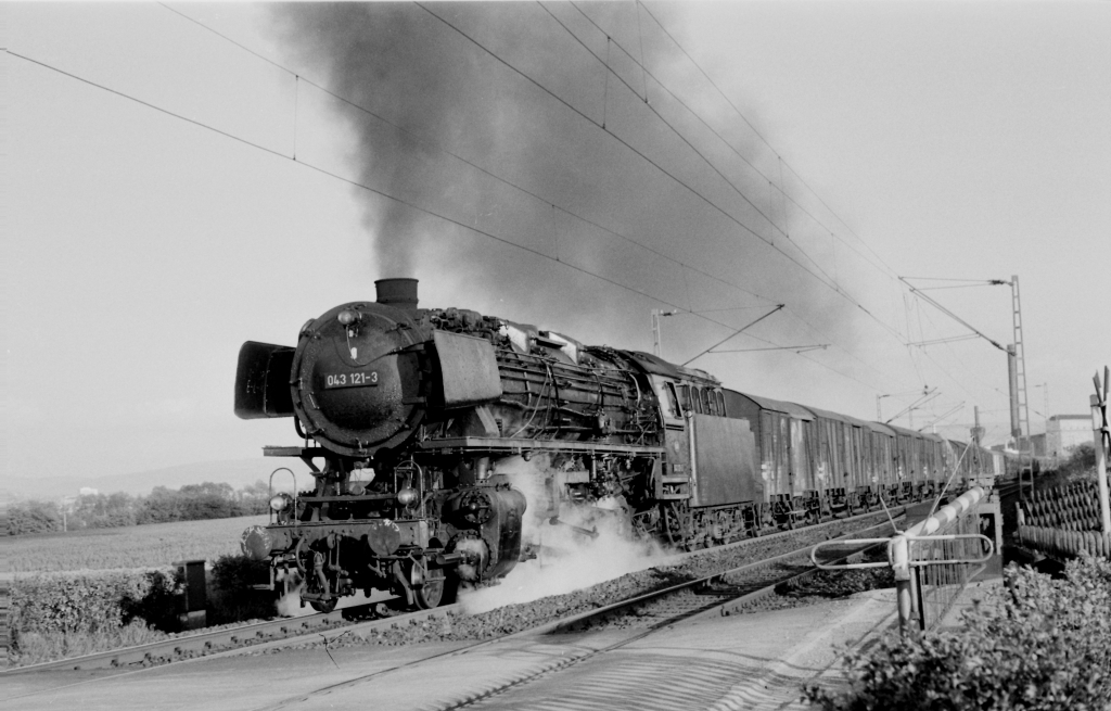 | Im Mai 1973 verläßt die 043 121 mit einem schweren Güterzug den Rbf Kassel über die Verbindungsbahn nach Obervellmar zur Fahrt nach Hamm. | ||||||||||||||||||||||||||||||||||||||||||||||||