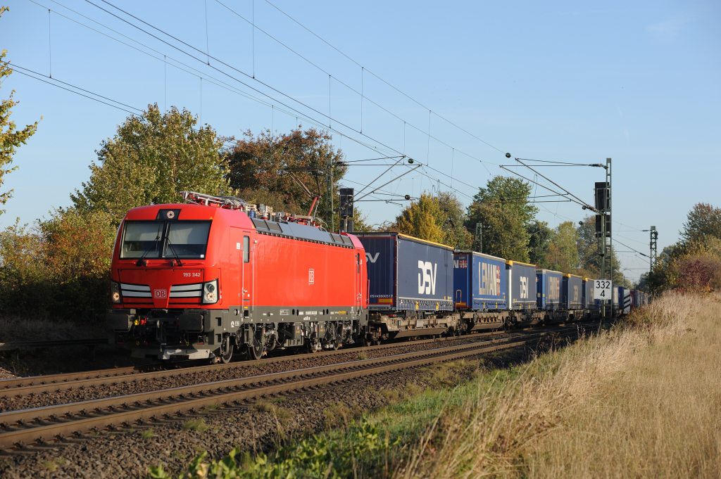 Der KT40011 von Taulov nach Gallarate mit 193 342 an der Spitze hat Mönchehof von Westen her erreicht, 6.10.2018. |