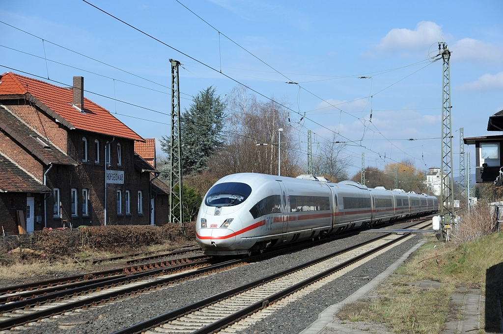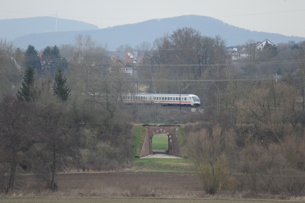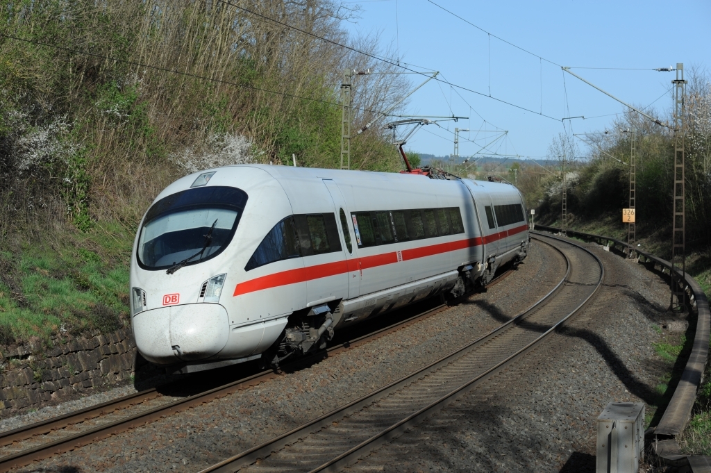 411 060 als ICE1746 kurz vor Grebenstein am 6. Mai 2011. An dieser Stelle beginnt die "Neubaustrecke", auf der die Züge seit 1875 den Ortskern von Grebenstein umfahren. |