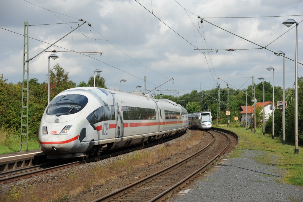 403 012 als ICE Frankfurt - München am 6. August 2011 in Immenhausen. Mit seiner Beklebung wirbt er für die Fußball- WM im Vorjahr. Auf dem Gegengleis fährt eine RT gen Grebenstein. |