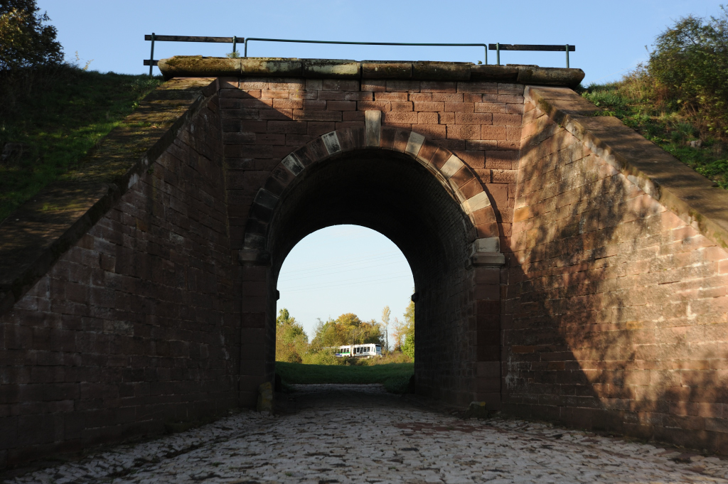 Durchlass unter der alten Trasse, im Hintergrund eine RT1 nach Hümme auf der "Umgehungsstrecke". Oktober 2019 |