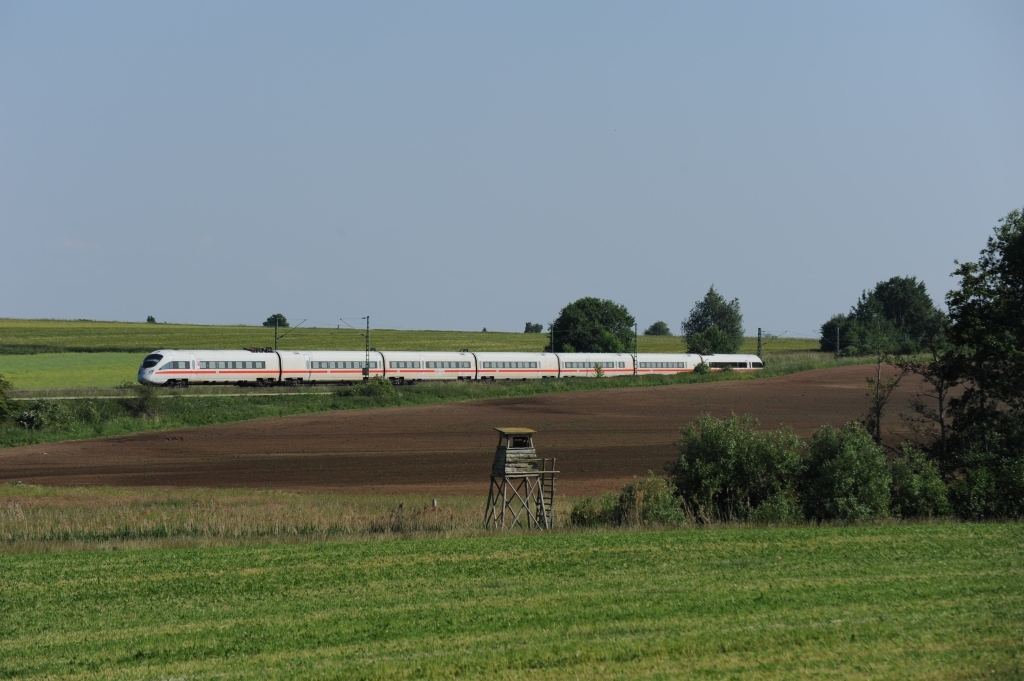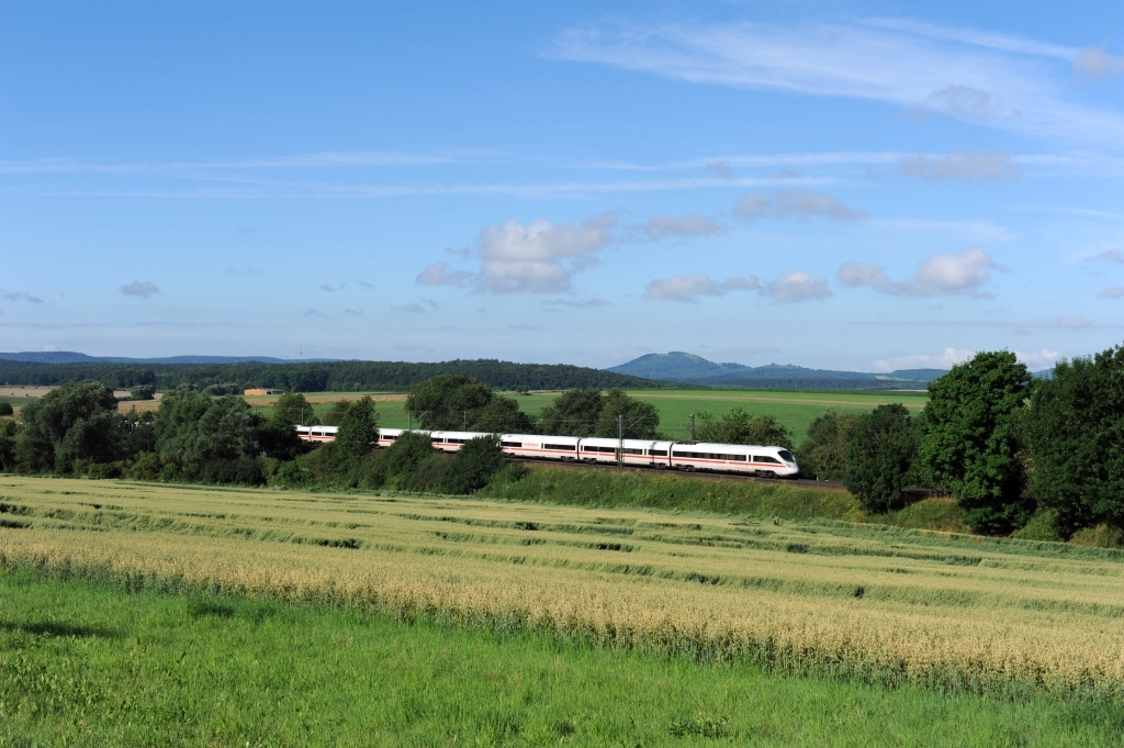 12. Juli 2014 bei Immenhausen: ein 411 fährt als ICE 1745 Richtung Kassel-Wilhelmshöhe (offensichtlich auf dem Gegengleis!), im Hintergrund der Hohe Dörnberg, mit knapp 580 über N.N. die höchste Erhebung im Habichtswald. |