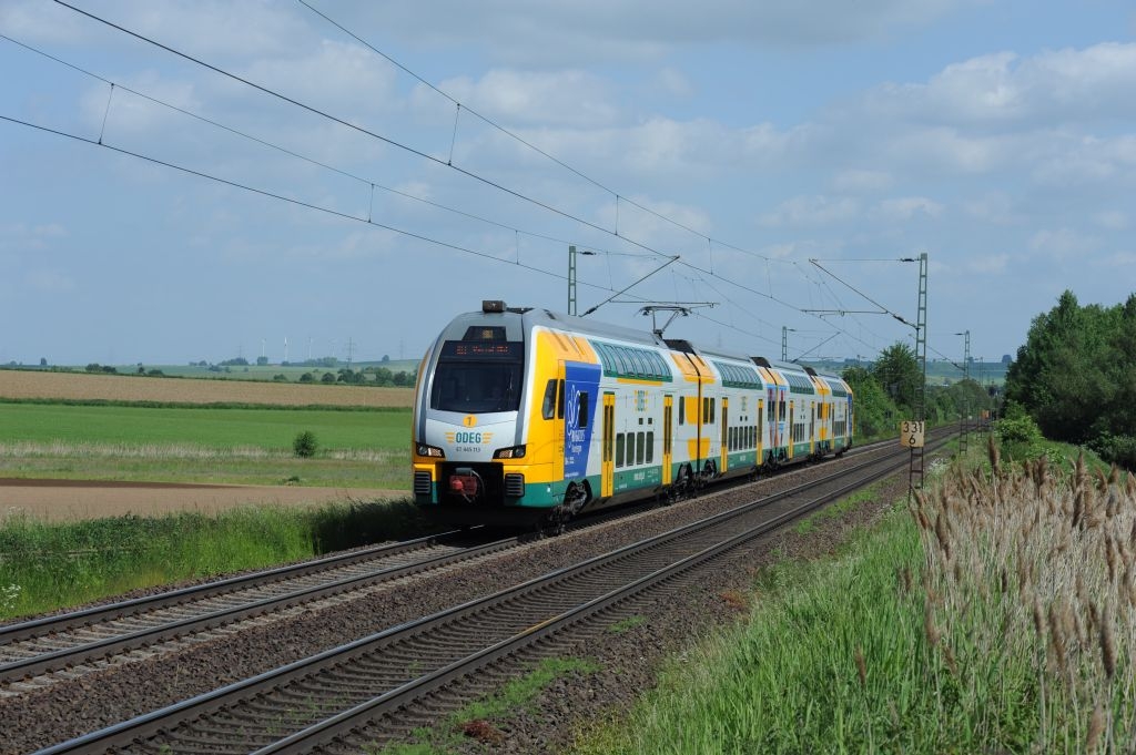 Bei Immenhausen: ein Doppelstocktriebwagen der ODEG hilft, die Besucher zum Hessentag 2015 nach Hofgeismar und zurück zu bringen. |