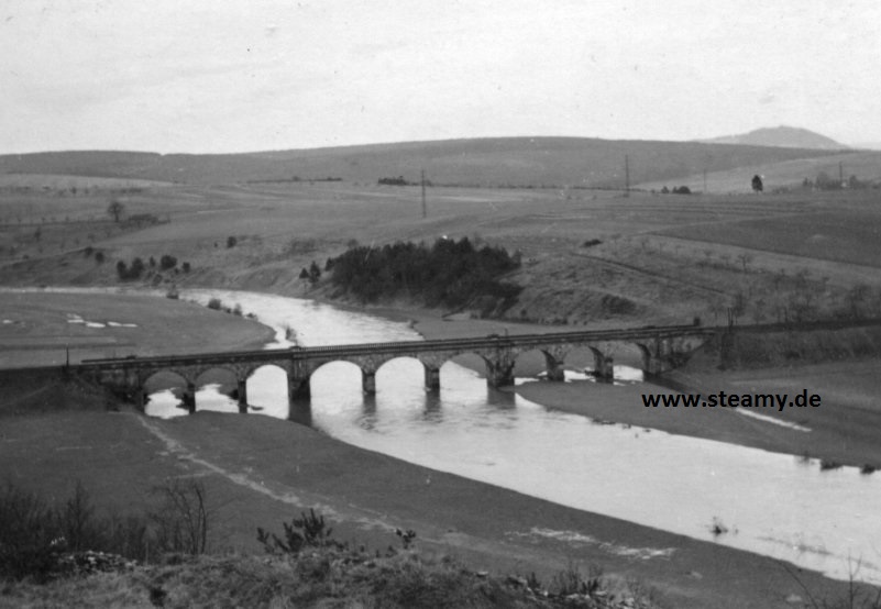 Um die M-W-B schnell wieder befahrbar zu machen wurde von einer Pioniereinheit eine Behelfsbrücke gebaut. Blick Richtung Grifte. Im Hintergrund am Waldrand verläuft die Trasse der Grifte-Gudensberger-Kleinbahn.