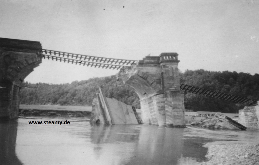 Dem durch die Bombadierung der Ederseesperrmauer am 17.05.1943 ausgelösten Hochwasser konnte die Brücke nicht standhalten. Blick Richtung Haldorf.