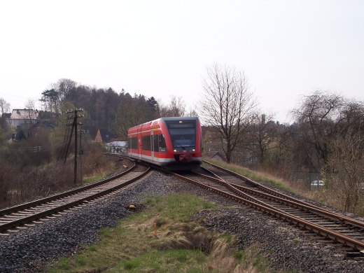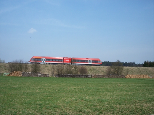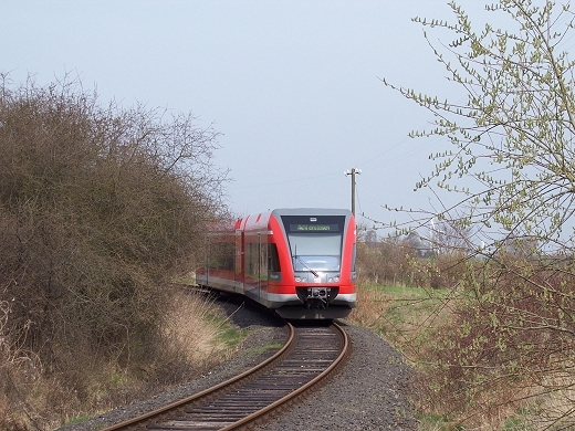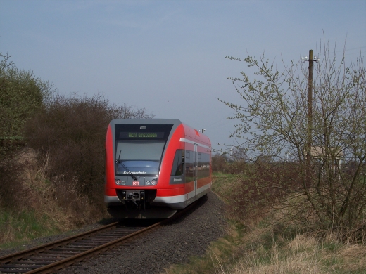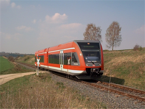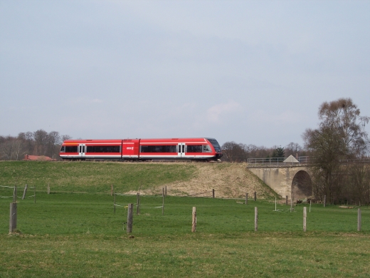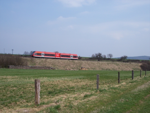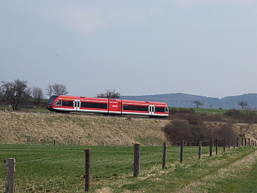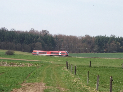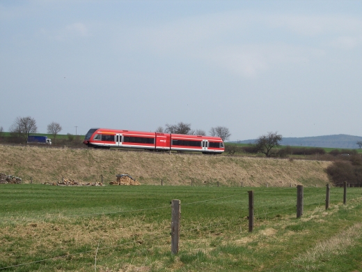 Da die Strecke nur mit sehr geringer Geschwindigkeit befahren wird, ergeben sich vielfaeltige Fotomotive. Der Triebwagen wird letztendlich in Wolfhagen an den Regionalexpress nach Kassel- Wilhelmshoehe angehaengt. |