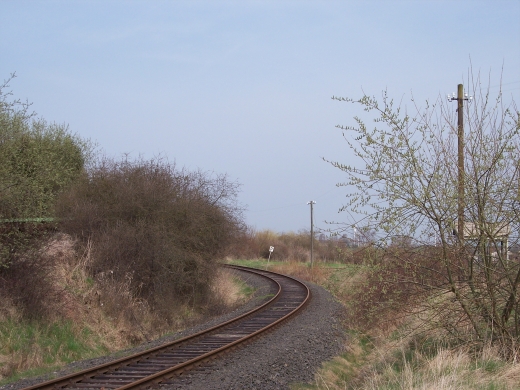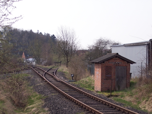 In einem Wald westlich von Wolfhagen wurde 1938 ein Munitionslager (Muna) gebaut. Die obligatorische Bahnanbindung geschah mittels einer 5 km langen Stichstrecke, die unmittelbar hinter dem Einfahrsignal begann. Da sich auf einem Teil des Gelaendes seit 1960 die Pommernkaserne der Bundeswehr befindet, ist die Anschlussbahn heute noch vorhanden und in Betrieb. Im Bild sieht man links, im Bogen verlaufend, die Strecke nach Volkmarsen. Der Sicherheit dient eine Schutzweiche. |