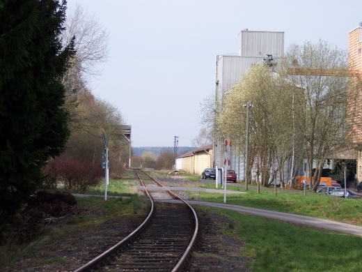 Bei Kilometer 0,5 befand sich ein, möglicherweise dreigleisiger, Uebergabebahnhof. Nach dem Krieg waren hier beschaedigte Damplokomotiven abgestellt. Auch das relativ junge Lagerhaus hatte sicher urspruenglich ein eigenes Gleis. |