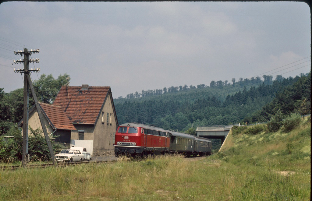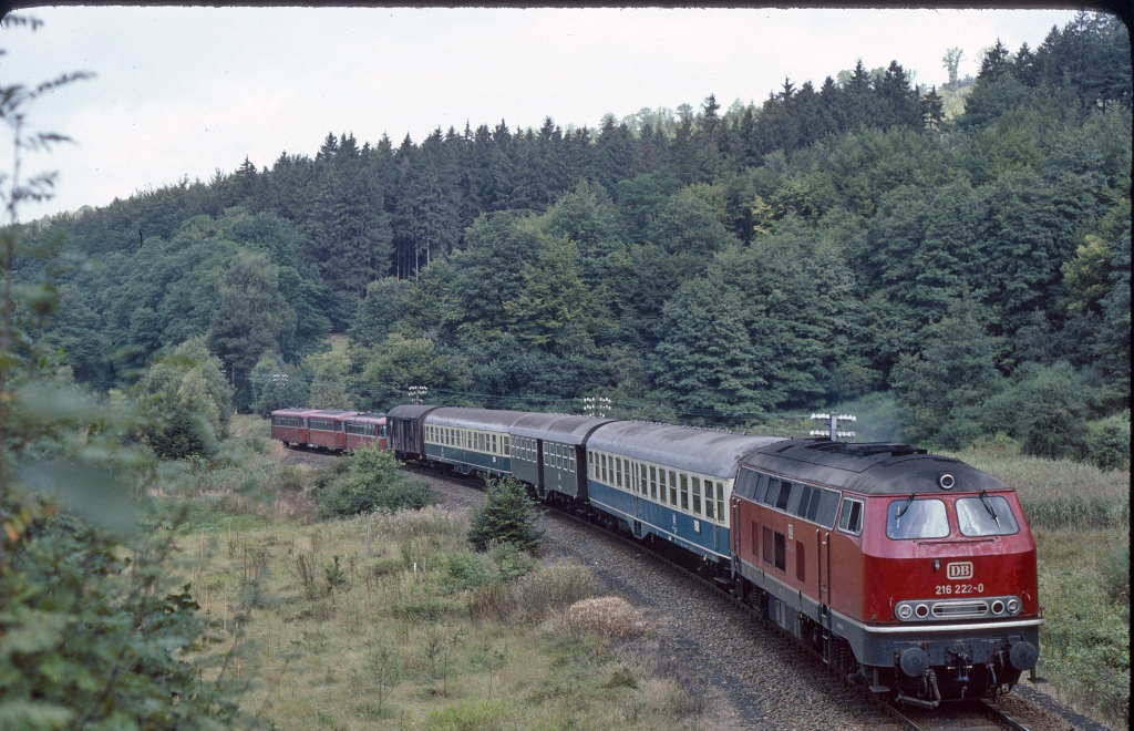 | Nur wenige Meter weiter östlich kam am 08.07.1981 dieses Bild von 216 223 vor dem Nahverkehrszug 7909 zustande. Für Überraschung sorgte der Vorkrieges-Eilzugwagen hinter der Lok. | ||||||||||||||||||||||||||||||||||||||||||||||||||||||||||||||||||||||||||||||||||||||||||||||||||||||||