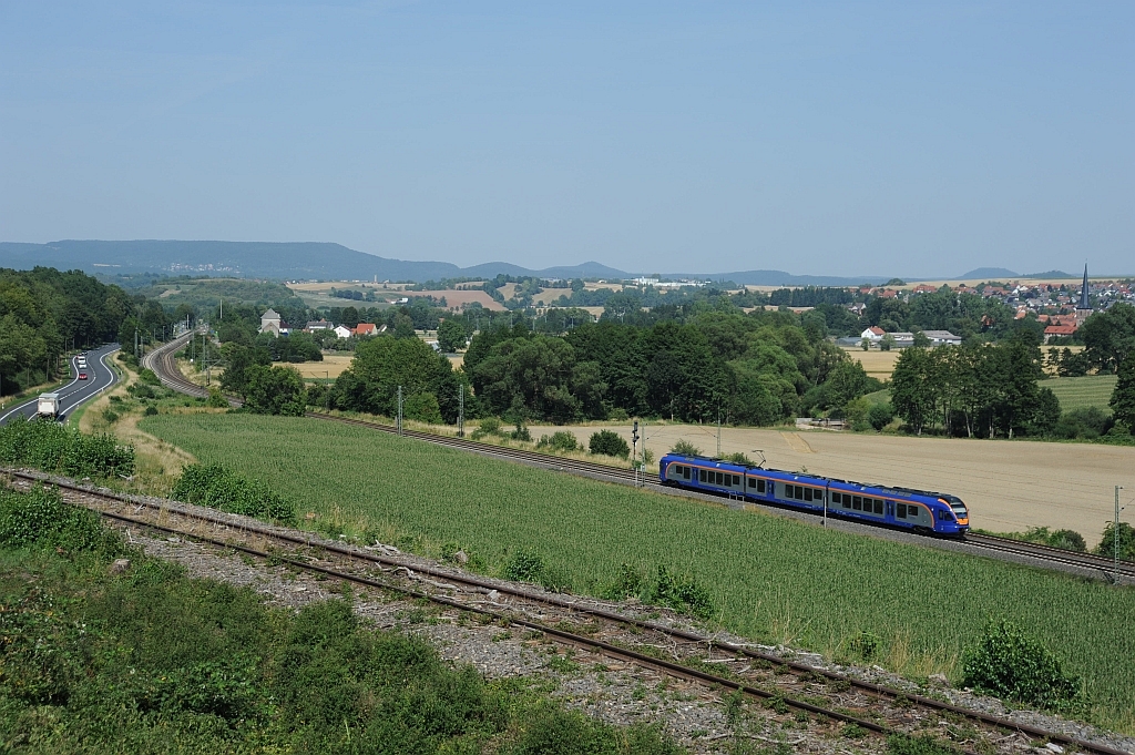 Bei Oetmannshausen wird die Nord-Süd-Strecke erreicht. Der Flirt hat gerade den Bahnhof Reichensachsen Richtung Sontra verlassen.
